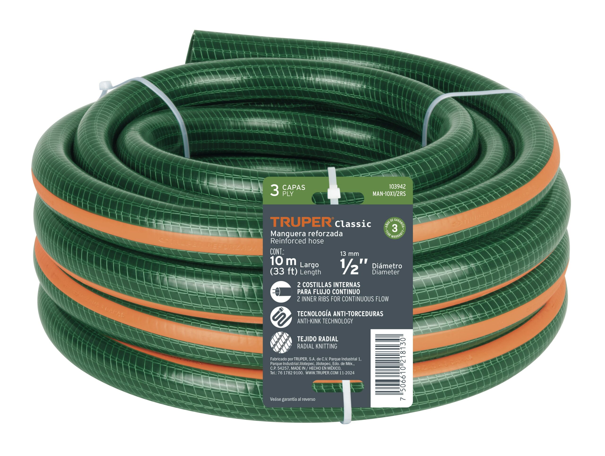 Manguera de jardín 1″, 3 capas, 10m, sin conexiones, TRUPER