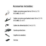 - Para electrodo revestido 6013, 6011 (Hasta 1/8″) y 7018 (Hasta 3/32″)