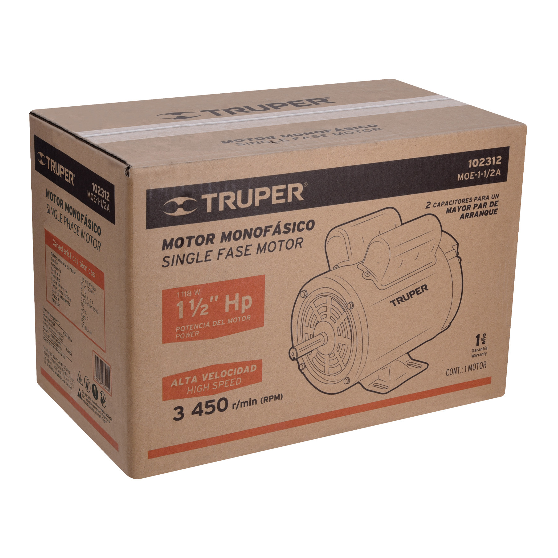 Motor eléctrico monofásico de 1 1/2 HP, alta velocidad